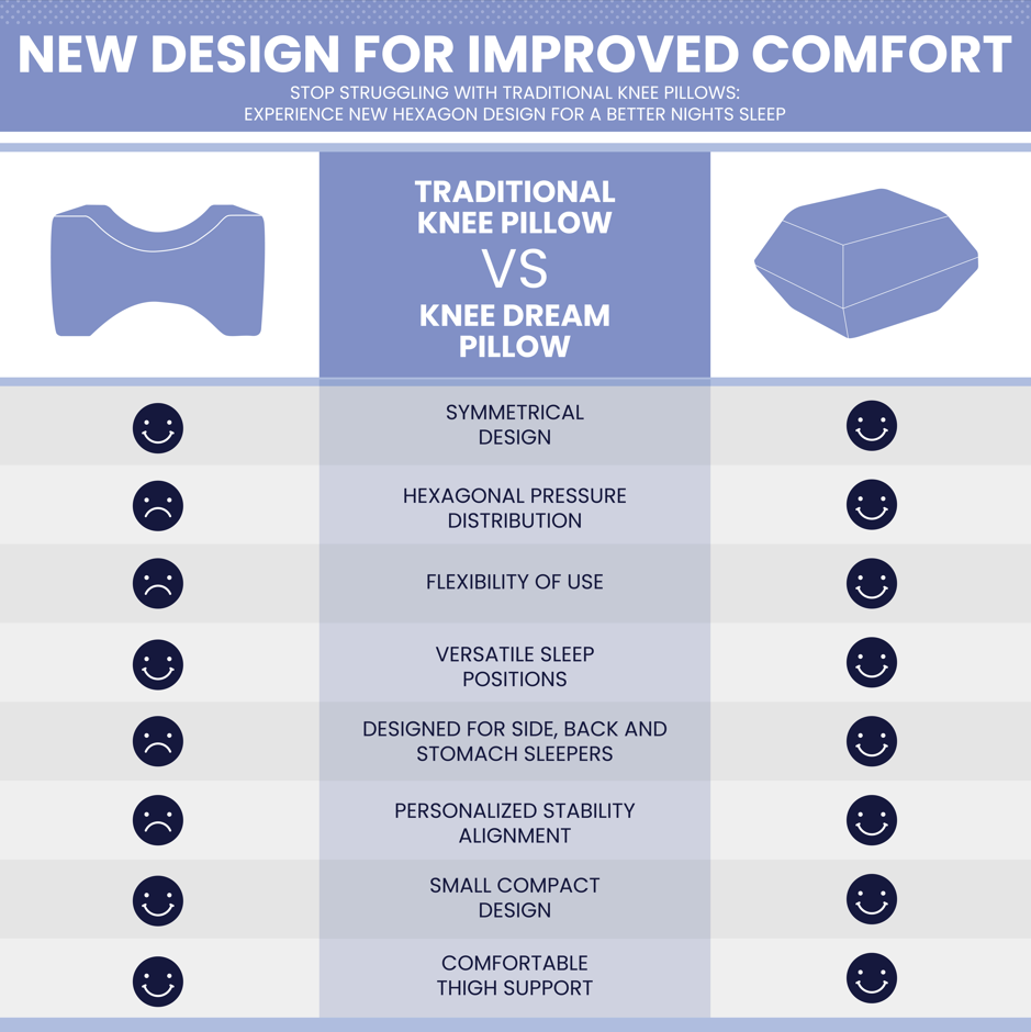 - FIRM SUPPORT - Unlike traditional hip pillow for side sleepers that lack the structural integrity needed for knee support, the Knee Dream Pillow stands out with its superior firmness. While conventional pillows compress and lose shape, leaving your knees unsupported and straining, our hexagon-shaped pillow retains its robust firm form, ensuring unyielding and lasting support.